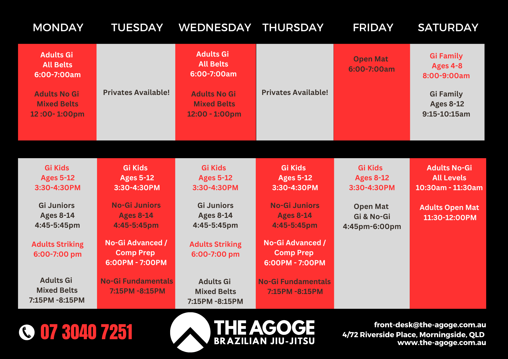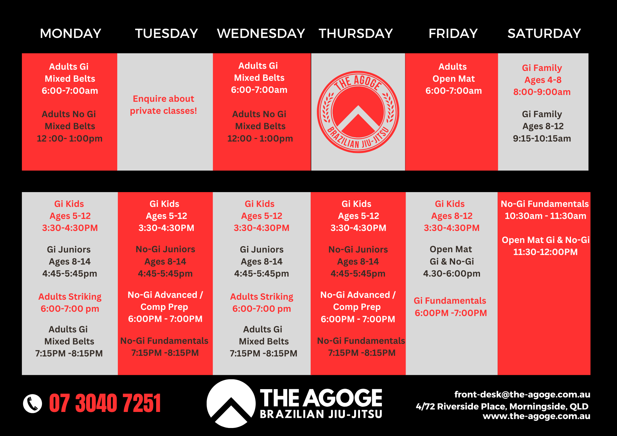 No weekday kids classes during School Holidays (QLD State School Calender).